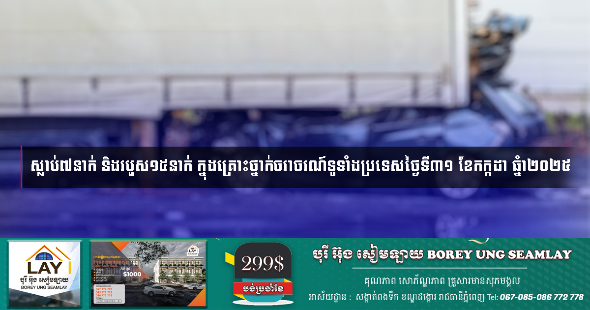 ស្លាប់៧នាក់ និងរបួស១៥នាក់ ក្នុងគ្រោះថ្នាក់ចរាចរណ៍ទូទាំងប្រទេសថ្ងៃទី៣១ ខែកក្កដា ឆ្នំា២០២៥