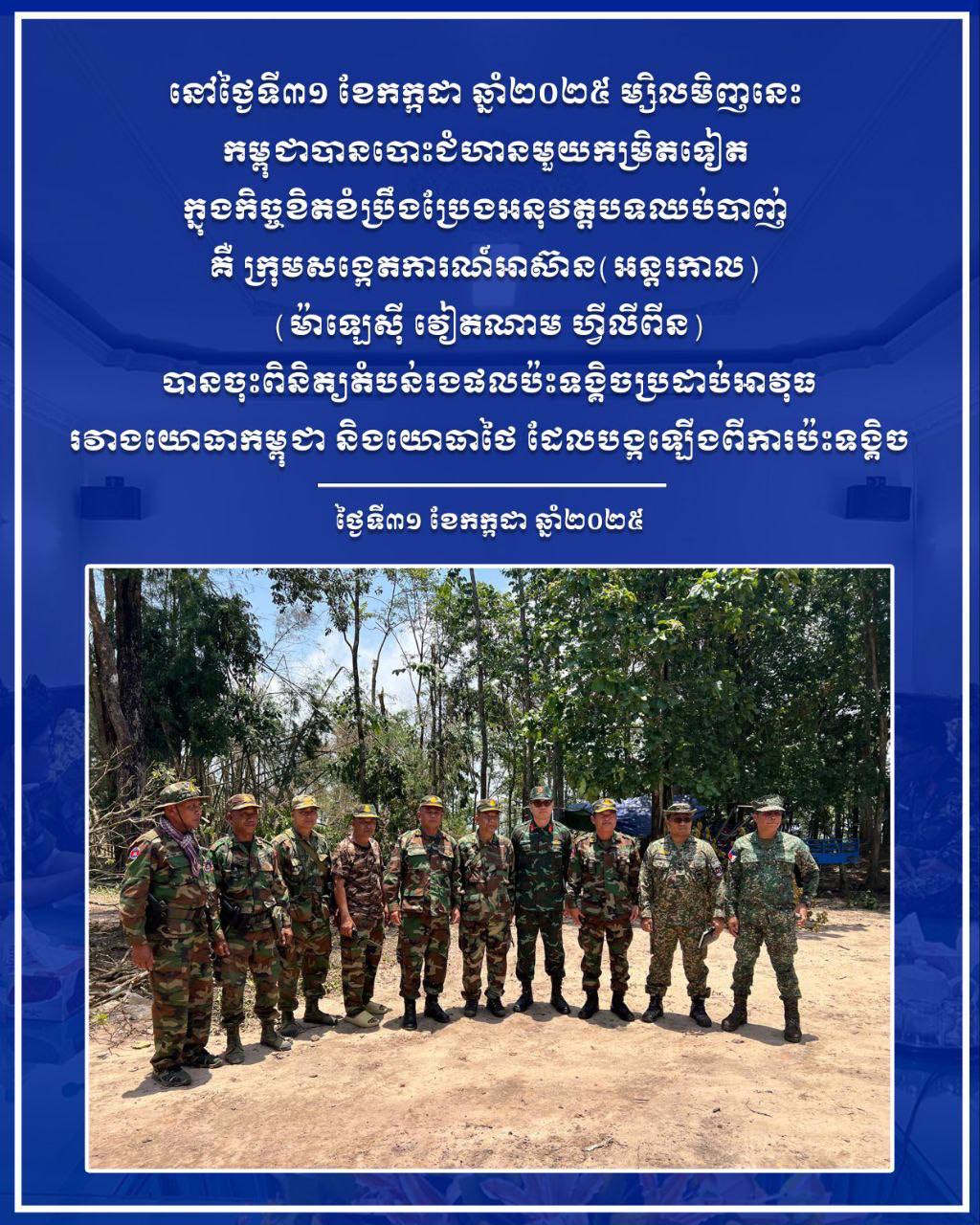 I. នៅថ្ងៃទី៣១ ខែកក្កដា ឆ្នាំ២០២៥ ម្សិលមិញនេះ កម្ពុជាបានបោះជំហានមួយកម្រិតទៀត ក្នុងកិច្ចខិតខំប្រឹងប្រែងអនុវត្តបទឈប់បាញ់ គឺក្រុមសង្កេតការណ៍អាស៊ាន (អន្តរកាល) បានចុះពិនិត្យតំបន់រងផលប៉ះពាល់នៃការទង្គិចប្រដាប់អាវុធរវាងយោធាកម្ពុជា និងយោធាថៃ ដែលបង្កឡើងពីការប៉ះទង្គិចគ្នា។