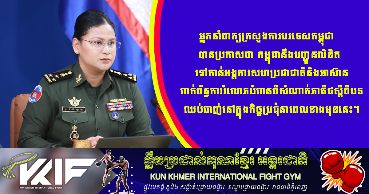 អ្នកនាំពាក្យក្រសួងការបរទេសកម្ពុជា បានប្រកាសថា កម្ពុជានឹងបញ្ជូនលិខិតទៅកាន់អង្គការសហប្រជាជាតិ និងអាស៊ាន ពាក់ព័ន្ធការរំលោភបំពានពីសំណាក់ភាគីថៃ ស្តីពីបទឈប់បាញ់នៅក្នុងកិច្ចប្រជុំនាពេលខាងមុខនេះ។