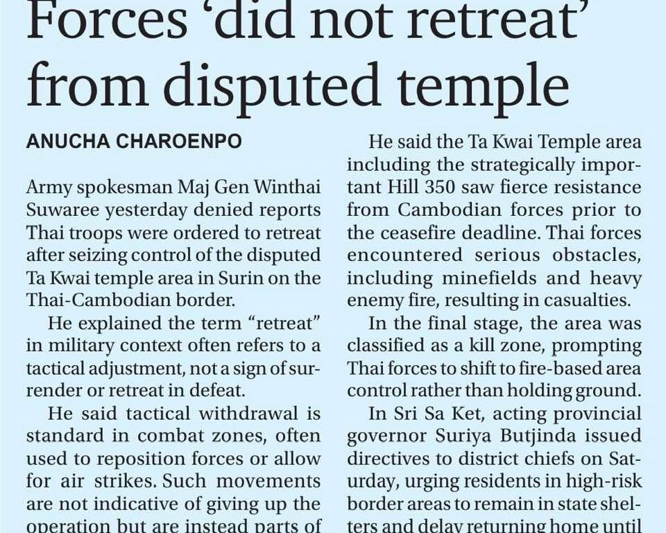 ប្រទេសថៃ ៖ កាសែតបាងកកប៉ុស្ត នៅថ្ងៃទី៤ ខែសីហា ឆ្នាំ២០២៥ បានផ្សាយថា ៖ អ្នកនាំពាក្យយោធាថៃប្រឹងពន្យល់ថា កងទ័ពថៃដកថយចេញពីប្រាសាទតាក្របីមិនមែន«រត់»ទេ តែជាការ«ដកថយយុទ្ធសាស្ត្រ» ដើម្បីទុកអោយយន្តហោះធ្វើការ ! ត្រង់នេះសួរថា [ បានន័យថាប្រុងកម្ទេចប្រាសាទ ? ] ហើយភ្នំទ្រព្យជាតំបន់មានមីនច្រើន ធ្វើអោយកងទ័ពថៃមានការខូចខាតច្រើនទើបដកទ័ពចេញ [ ចូលចេញតាមណាមិនប៉ះមីនផង ? ] ៕