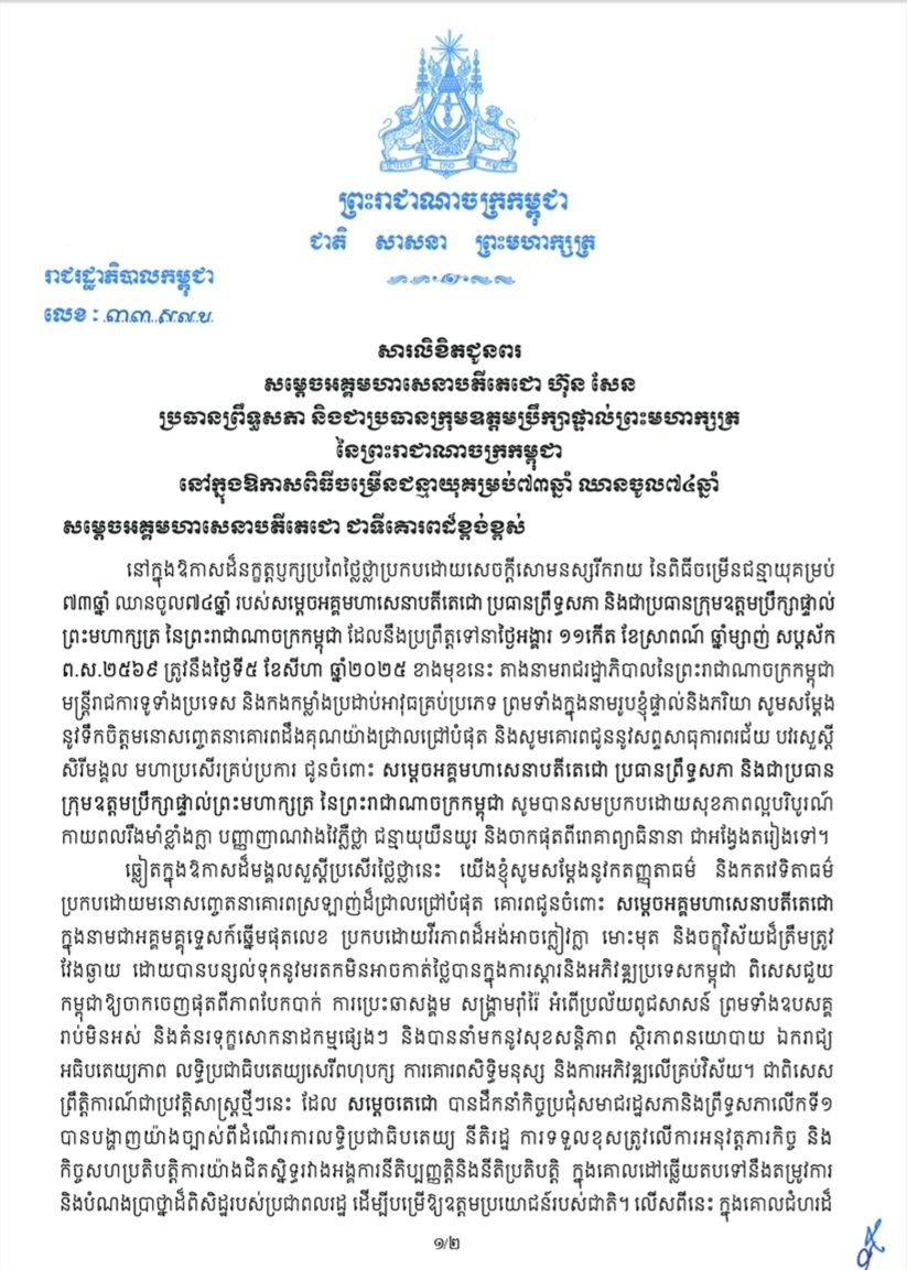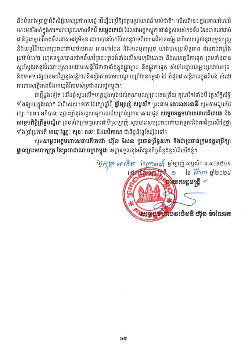 សម្តេចមហាបវរធិបតី ហ៊ុន ម៉ាណែត នាយករដ្ឋមន្ត្រីនៃព្រះរាជាណាចក្រកម្ពុជា ផ្ញើសារលិខិតជូនពរ សម្តេចអគ្គមហាសេនាបតីតេជោ ហ៊ុន សែន ប្រធានព្រឹទ្ធសភា នៃព្រះរាជាណាចក្រកម្ពុជា និងជាប្រធានក្រុមឧត្តមប្រឹក្សាផ្ទាល់ ព្រះមហាក្សត្រ ក្នុងឱកាសដ៏នក្ខត្តឫក្សនៃខួបចម្រើនជន្មាយុរបស់ សម្តេចអគ្គមហាសេនាបតីតេជោ នៅថ្ងៃទី០៥ សីហា ២០២៥៕