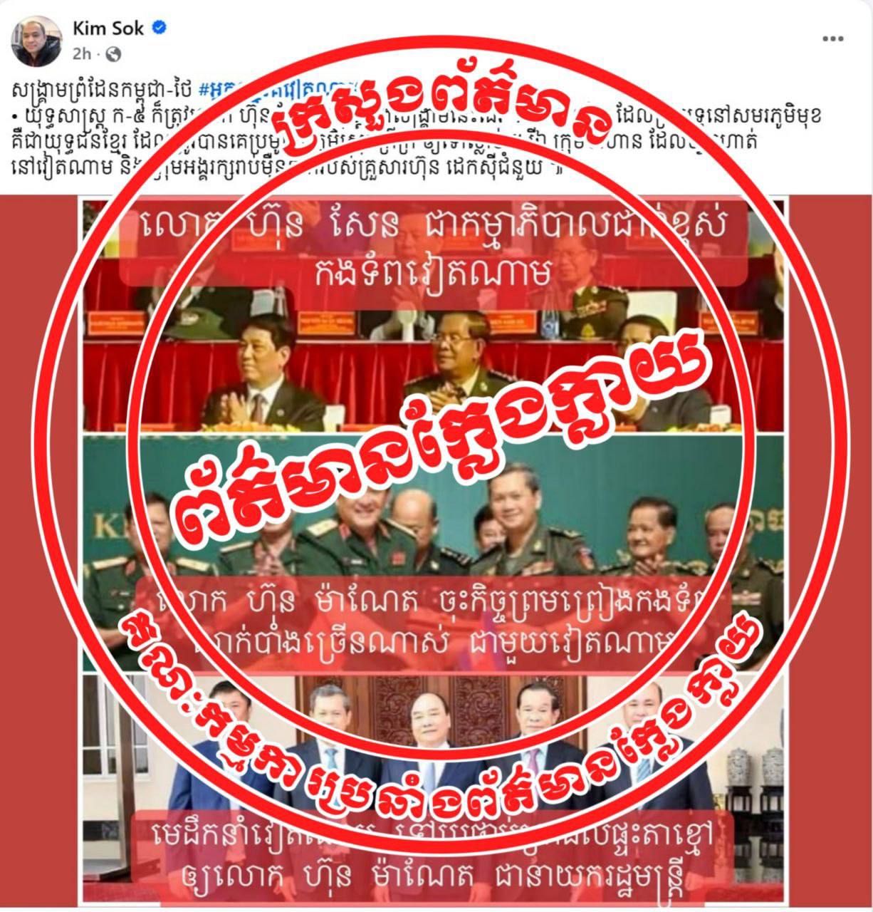 ព័ត៌មានដែលត្រូវបានបញ្ចេញតាមបណ្តាញសង្គមនេះ ជាព័ត៌មានក្លែងក្លាយបង្កើតឡើងក្នុងចេតនាបំបាក់ស្មារតីកងទ័ព និងប៉ះពាល់ដល់សន្តិសុខជាតិ។