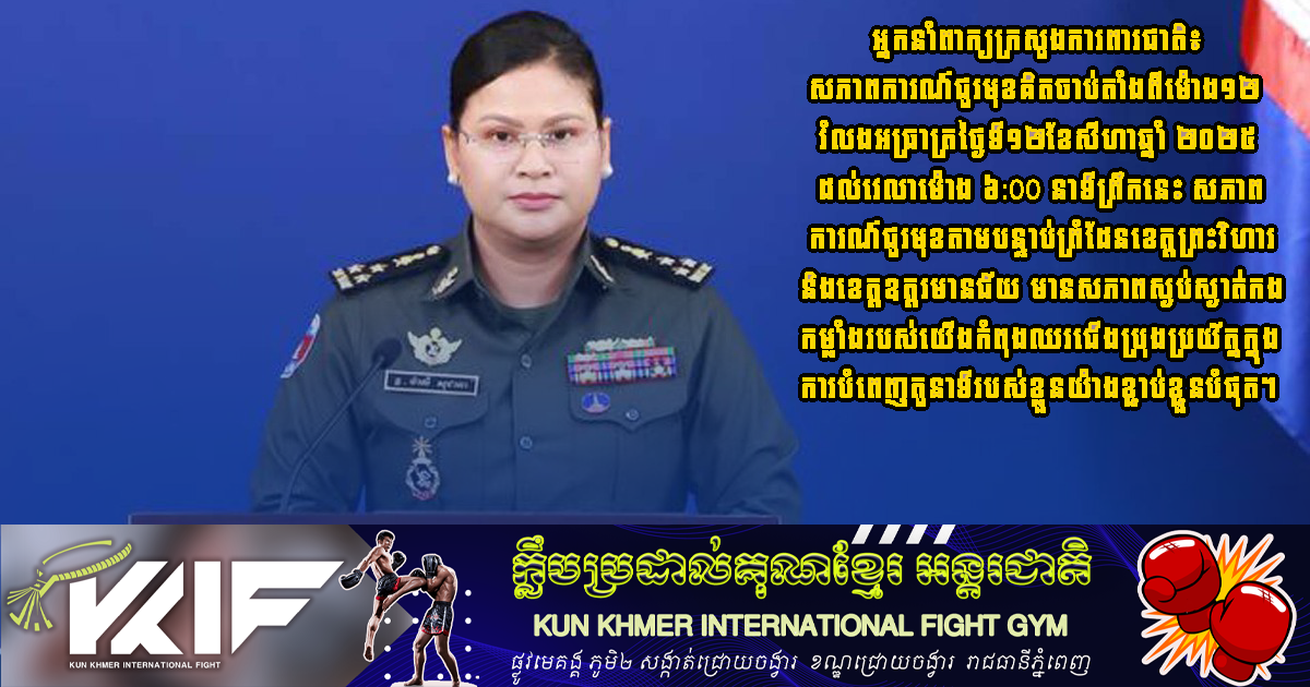 អ្នកនាំពាក្យក្រសួងការពារជាតិ៖ សភាពការណ៍ជួរមុខគិតចាប់តាំងពីម៉ោង ១២ រំលងអធ្រាត្រថ្ងៃទី១២ខែសីហាឆ្នាំ ២០២៥ ដល់វេលាម៉ោង ៦:00 នាទីព្រឹកនេះ សភាពការណ៍ជួរមុខតាមបន្ទាប់ព្រំដែនខេត្តព្រះវិហារ និងខេត្តឧត្តរមានជ័យ មានសភាពស្ងប់ស្ងាត់ កងកម្លាំងរបស់យើងកំពុងឈរជើងប្រុងប្រយ័ត្ន ក្នុងការបំពេញតួនាទីរបស់ខ្លួនយ៉ាងខ្ជាប់ខ្ជួនបំផុត។