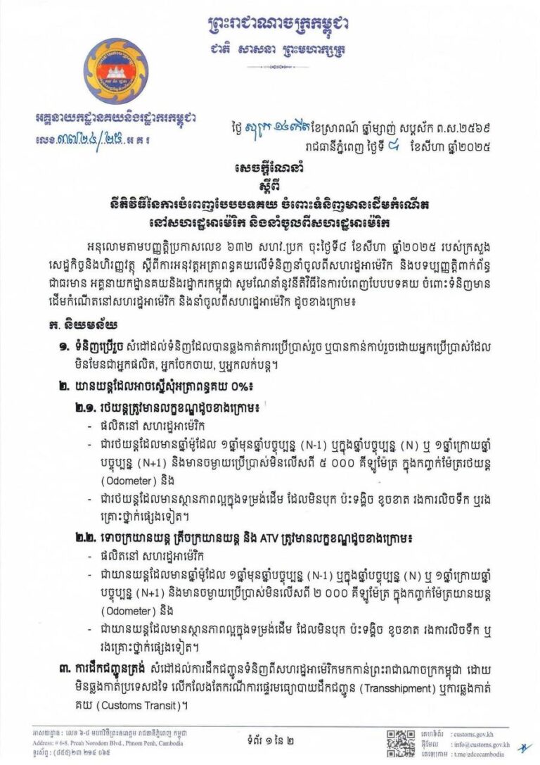 ភ្នំពេញ៖ អគ្គនាយកដ្ឋានគយ ចេញសេចក្ដីណែនាំស្ដីពីនីតិវិធីនៃការបំពេញបែបបទគយ ចំពោះទំនិញអាម៉េរិក ដោយលក្ខខណ្ឌយានយន្តដែលអាចស្នើសុំអត្រាពន្ធគយ ០%៖
