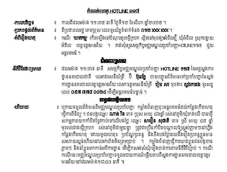 ករណី “ ឃាតកម្ម “ បណ្តាលឲ្យស្លាប់០១នាក់ (ស្រី) ត្រូវបាននគរបាលចុះអន្តរាគមន៍ ក្រោយប្រជាពលរដ្ឋរាយការណ៍មកកាន់សមត្ថកិច្ច Hotline ១១៧ ។