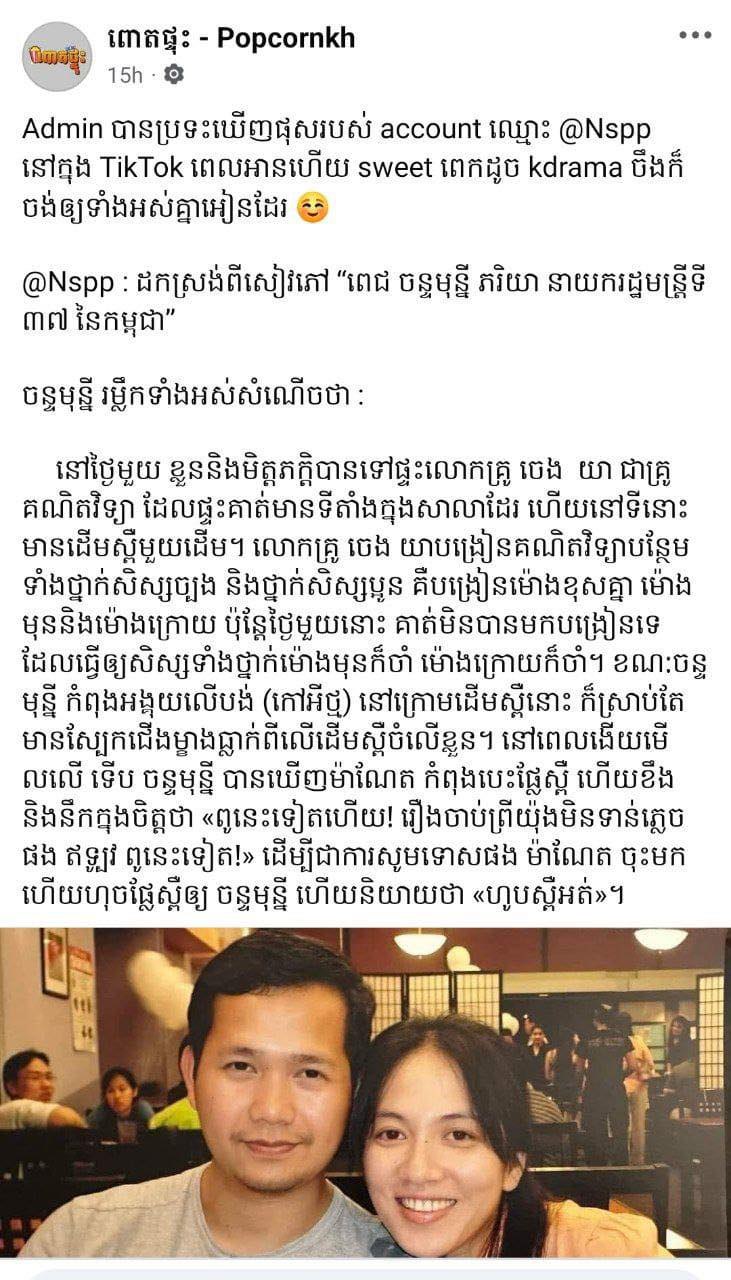 «ប៉ុន្មានឆ្នាំមុនផ្ទុះរឿងផ្លែពោតជាអាវុធប្រល័យលោក។ ប៉ុន្មានថ្ងៃនេះផ្ទុះរឿងផ្លែស្ពឺ ខ្ញុំចេះតែឆ្ងល់ថាមានរឿងអីទៀតហើយ? លុះដល់ស្រាវជ្រាវទៅទើបដឹងថា វាជារឿងរបស់នាយករដ្ឋមន្ត្រីបច្ចុប្បន្ន ជាមួយស្ត្រីមួយកាលពីក្មេងដែលផ្អែកសំខាន់លើសៀវភៅដែលសរសេរ ដោយលោក ឆាយ សុផល។ វាជារឿងចាប់ផ្តើមពីការមិនចូលចិត្តដូចគ្នារវាងខ្ញុំនិងភរិយានៅពេលដែលមិនទាន់ស្គាល់គ្នា។ ឯកូនរបស់ខ្ញុំចាប់ផ្តើម ពីផ្លែស្ពឺឬ (ហូបស្ពឺអត់)។ ខ្ញុំស្រាវជ្រាវរឿងនេះពីគ្រុបគ្រួសារដែលប្អូនៗ ពិសេសស្រីពៅបង្អាប់បងថ្លៃ។ (ហូបស្ពឺអត់)»៕