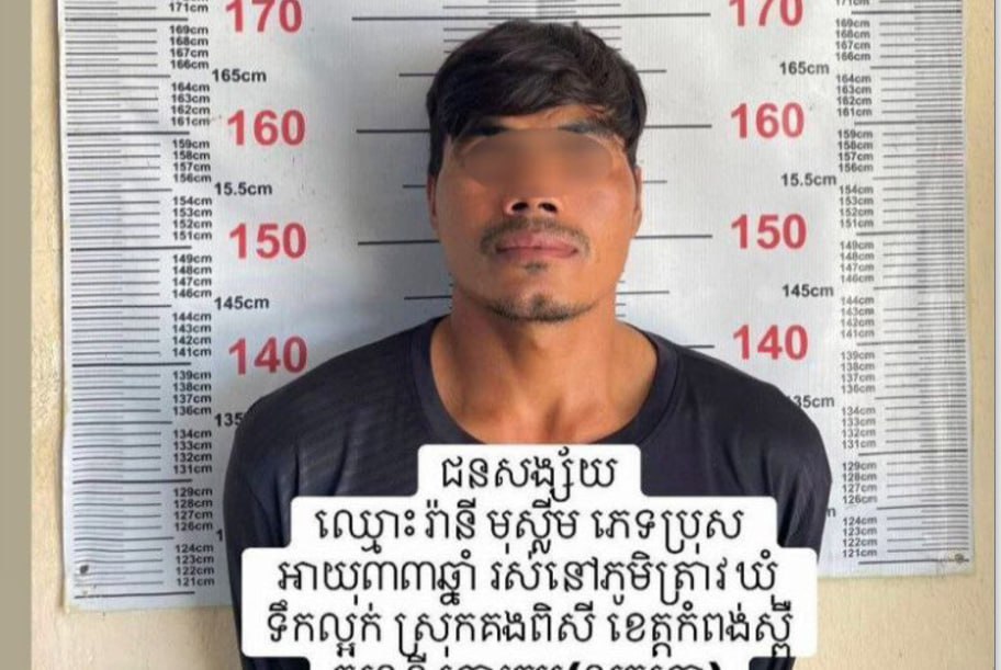 ខេត្តកំពង់ស្ពឺ ៖ ជនសង្ស័យម្នាក់ដែលជាជនជាតិឥស្លាម ត្រូវបានកម្លាំងនគរបាលស្រុកគងពិសីធ្វើការស្រាវជ្រាវឃាត់ខ្លួនបាន ខណៈដែលសង្ស័យលួចសត្វគោញីមួយក្បាលរបស់ប្រជាពលរដ្ឋ ដែលយកទៅចងឱ្យស៊ីស្មៅហើយស្រាប់តែបាត់ ក៏ដាក់ពាក្យបណ្តឹងពីភិនភាគសត្វគោឱ្យនគរបាលជួយអន្តរាគមន៍។ ឃាត់ខ្លួនជន សង្ស័យបាន កាលពី ថ្ងៃទី១២ ខែសីហា ឆ្នាំ២០២៥ នៅចំណុចក្នុងភូមិទឹក ឃុំរការកោះ ស្រុកគងពិសី ខេត្តកំពង់ស្ពឺ ។