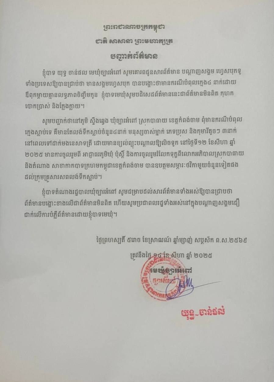 ការផ្សាយនេះ គឺជាព័ត៌មានបំភ្លៃ! នេះជាករណីលង់ទឹកស្លាប់នៅស្រុកបាធាយ ខេត្តកំពង់ចាម។