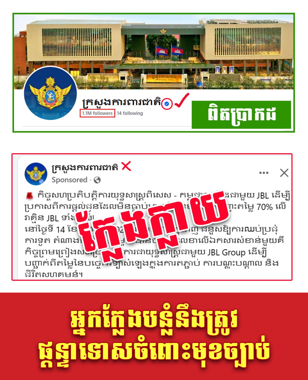 ក្រសួងការពារជាតិ សូមអំពាវនាវដល់បងប្អូនប្រជាពលរដ្ឋ និងសាធារណជន ត្រូវត្រួតពិនិត្យប្រភពព័ត៌មានពិតប្រាកដពីគណនីផ្លូវការ របស់ក្រសួងការពារជាតិ។
