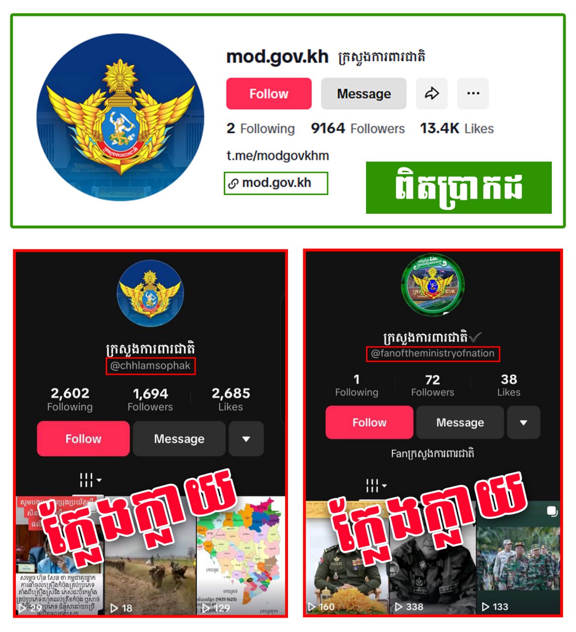 ក្រសួងការពារជាតិ សូមជម្រាបជូនសាធារណជនជ្រាបពីគណនីផ្លូវការ និងគណនីក្លែងក្លាយនៅលើបណ្ដាញសង្គមហ្វេសប៊ុក(Facebook) និង ទិកតុក(Tiktok) មានគូសបញ្ជាក់ដូចក្នុងរូបភាព។
