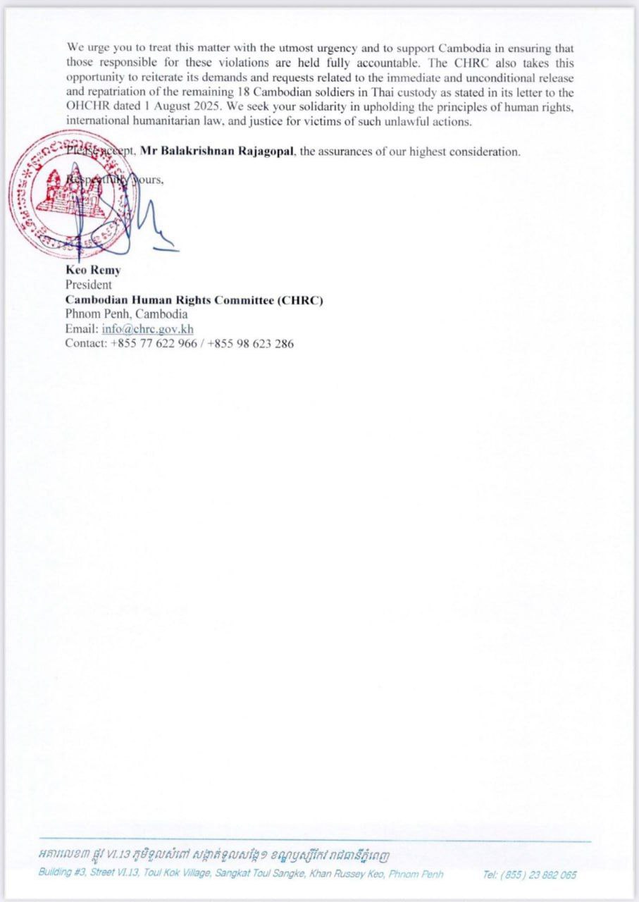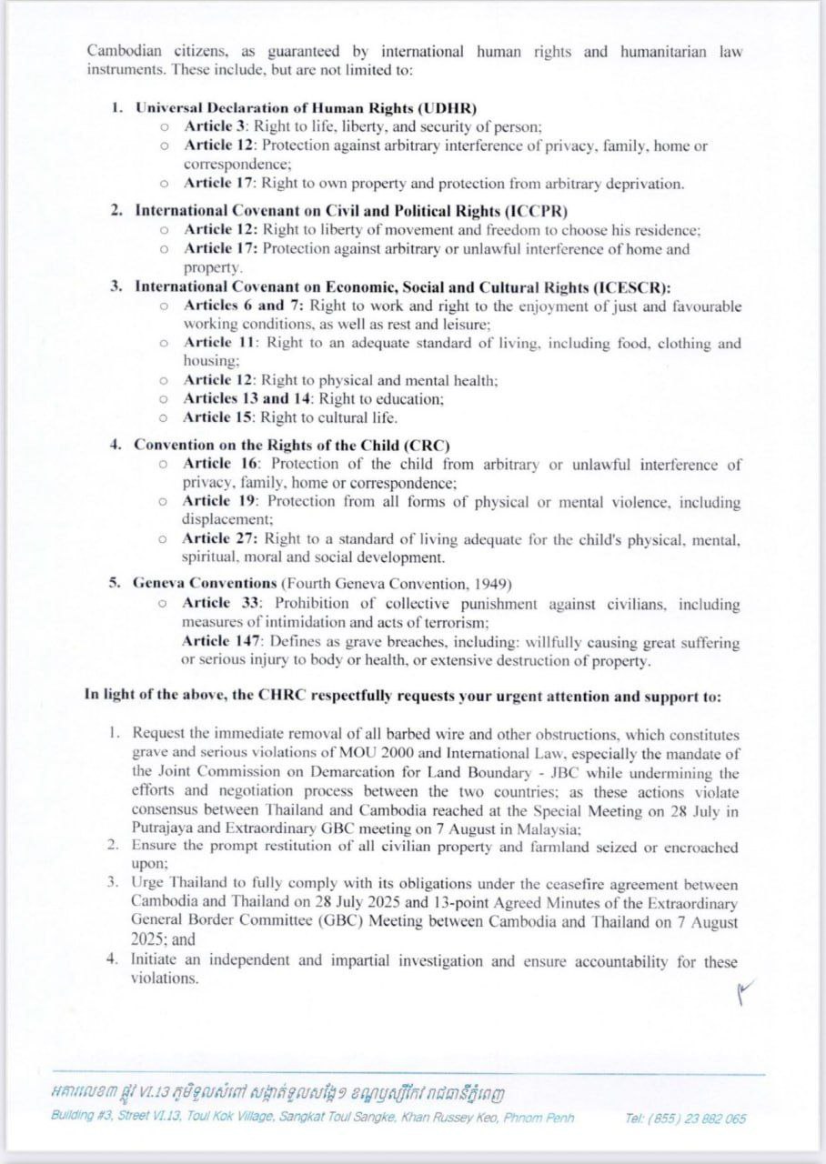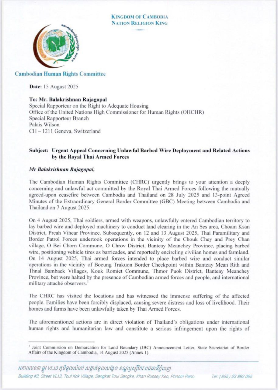 ញ្ញត្តិបន្ទាន់! របស់ប្រធានគណៈកម្មាធិការសិទ្ធិមនុស្សកម្ពុជា ជូនទៅអ្នករាយការណ៍ពិសេសទទួលបន្ទុកសិទ្ធលំនៅដ្ឋាន មានទីតាំងប្រចាំនៅហ្សឺណែវ ដើម្បី៖ ១- ជំរុញឱ្យភាគីថៃរើបន្លាលួស និងកង់ឡាន ដែលបានដាក់ពង្រាយខុសច្បាប់លើទឹកដីកម្ពុជាចេញវិញ។ ២- ធានាការប្រគល់ទ្រព្យសម្បត្តិ និងស្រែចំការរបស់ពលរដ្ឋខ្មែរទាំងអស់ ដែលត្រូវបានភាគីថៃរំលោភយក។ ៣- ជំរុញឱ្យភាគីថៃគោរពកិច្ចព្រមព្រៀងឈប់បាញ់ និងព្រមព្រៀង១៣ចំណុច នៃកិច្ចប្រជុំ GBC។ ៤- បង្កើតក្រុមការងារចំពោះកិច្ច ក្នុងការស៊ើបអង្កេតនិងស្វែងរកអ្នកទទួលខុសត្រូវ និងអ្នកពាក់ព័ន្ធចំពោះអំពើរំលោភបំពាននេះ និងជំរុញឱ្យភាគីថៃដោះលែងកងទ័ពកម្ពុជាទាំង១៨ ជាបន្ទាន់ និងឥតលក្ខខណ្ឌ៕
