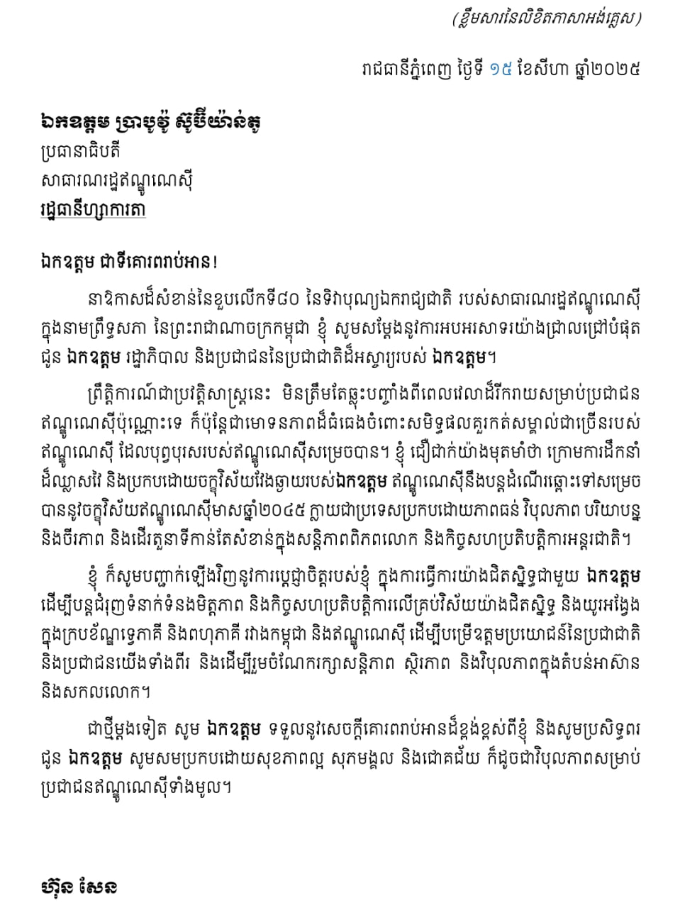 តាមរយៈលិខិតរបស់សម្ដេច បានឱ្យដឹងដូច្នេះថា៖ នាឱកាសដ៏សំខាន់នៃខួបលើកទី៨០ នៃទិវាបុណ្យឯករាជ្យជាតិ របស់សាធារណរដ្ឋឥណ្ឌូណេស៊ី ក្នុងនាមព្រឹទ្ធសភានៃព្រះរាជាណាចក្រកម្ពុជា ខ្ញុំ សូមសម្តែងនូវការអបអរសាទរយ៉ាងជ្រាលជ្រៅបំផុត ជូន ឯកឧត្តម រដ្ឋាភិបាល និងប្រជាជននៃប្រជាជាតិដ៏អស្ចារ្យរបស់ ឯកឧត្តម។