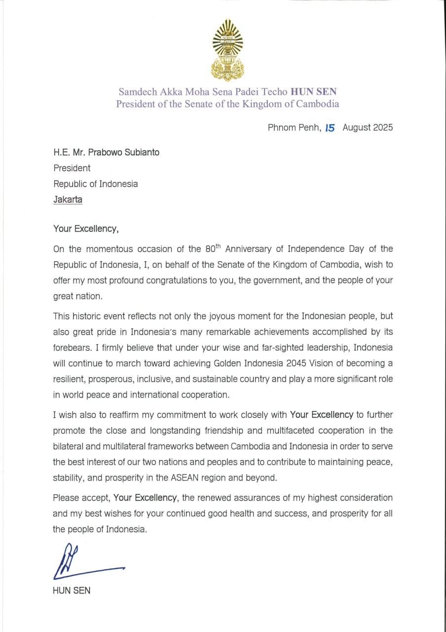 (ភ្នំពេញ)៖ សម្ដេចតេជោ ហ៊ុន សែន ប្រធានព្រឹទ្ធសភាកម្ពុជា នៅថ្ងៃទី១៦ ខែសីហា ឆ្នាំ២០២៥ បានផ្ញើលិខិតអបអរសាទរជូន ឯកឧត្តម ប្រាបូប៉ូ ស៊ូប៊ីយ៉ាន់តូ ប្រធានាធិបតីសាធារណរដ្ឋឥណ្ឌូណេស៊ី ក្នុងឱកាសខួបលើកទី៨០ នៃទិវាបុណ្យឯករាជ្យជាតិ របស់សាធារណរដ្ឋឥណ្ឌូណេស៊ី។