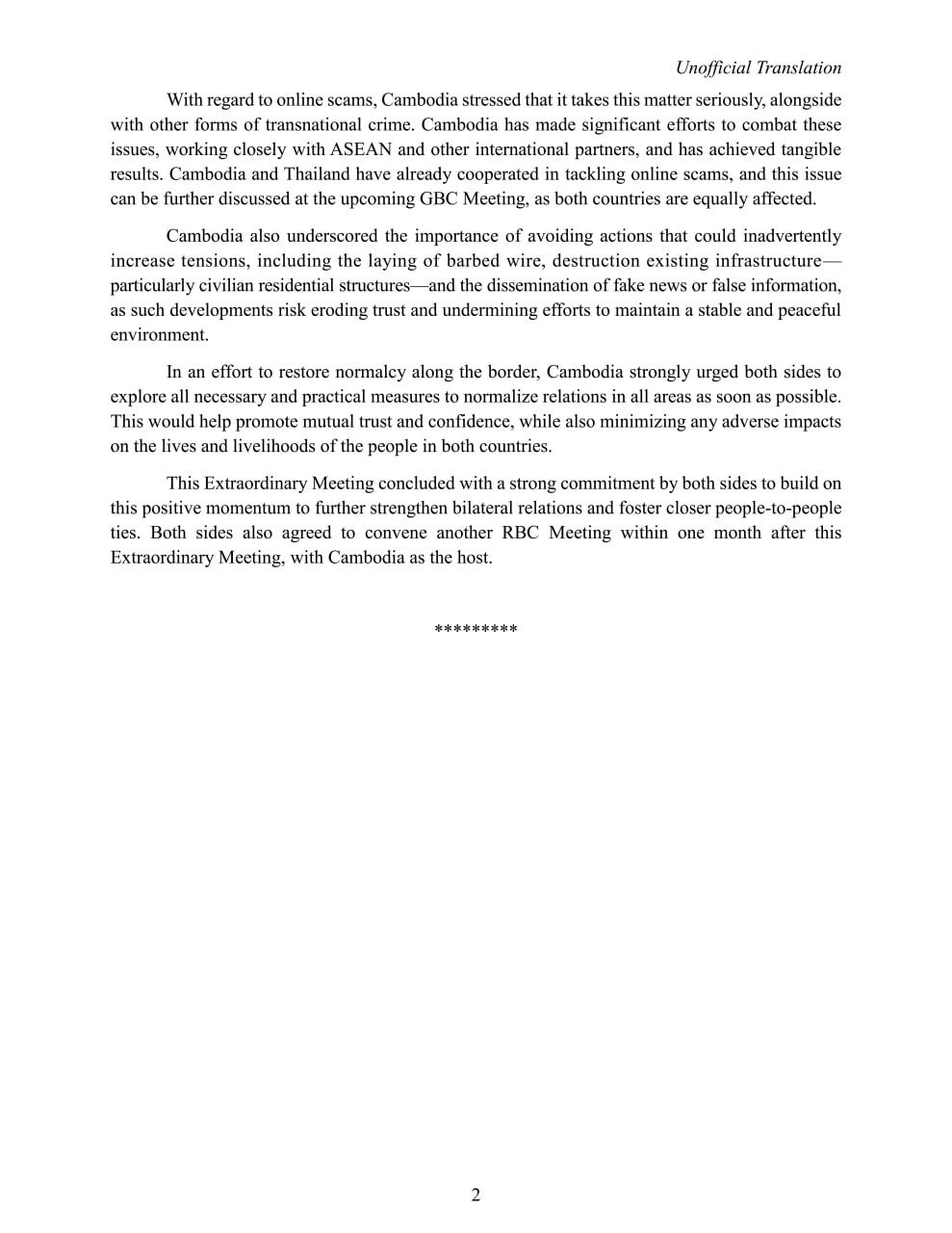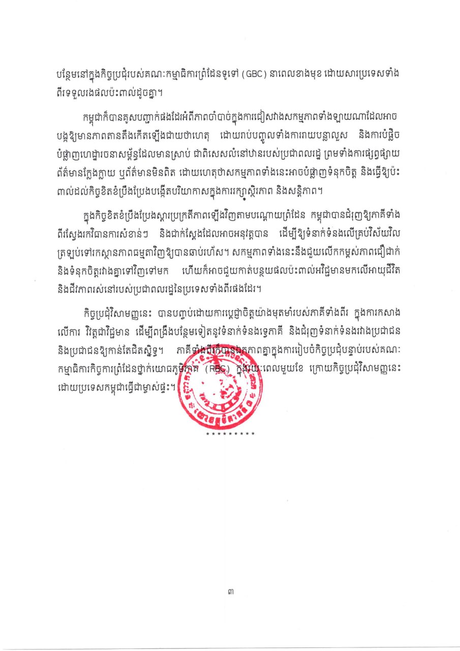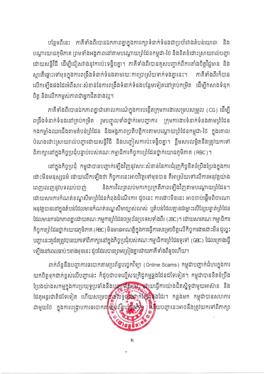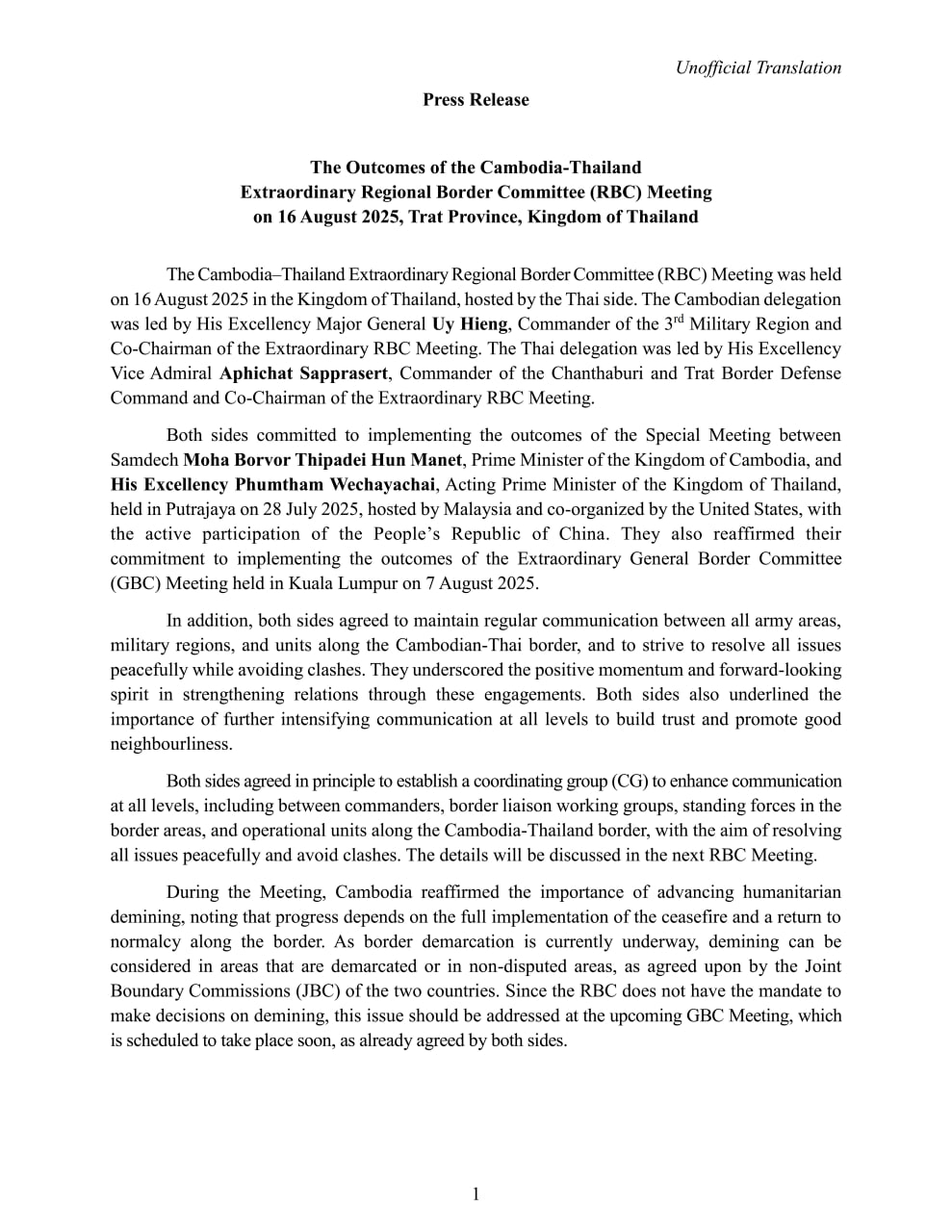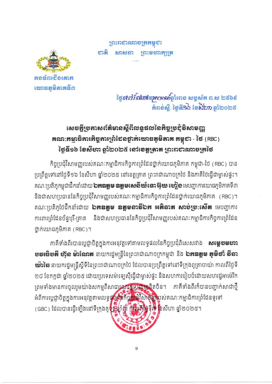 សេចក្តីប្រកាសព័ត៌មាន ស្តីពីលទ្ធផលនៃកិច្ចប្រជុំវិសាមញ្ញ គណៈកម្មាធិការកិច្ចការព្រំដែនថ្នាក់យោធភូមិភាគ កម្ពុជា-ថៃ (RBC) ថ្ងៃទី១៦ ខែសីហា ឆ្នាំ២០២៥ នៅខេត្តត្រាត ព្រះរាជាណាចក្រថៃ