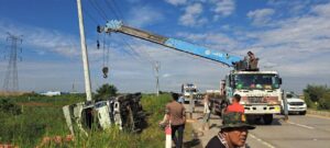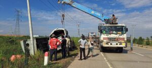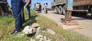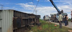 ប្រភពព័ត៌មានបានបញ្ជាក់ថា តៃកុងងោកងុយមួយភាំង ភ្ញាក់ខ្លួនជើងជាន់ហ្វ្រាំង ក្នុងល្បឿនមធ្យម បណ្តាលឱ្យរេចង្កូតមកស្តាំ ក្រឡាប់ផ្ងា ជើងជះបាវស្រូវទម្ងន់ជាង២៥តោនចូលក្នុង ប្រឡាយទាំងអស់និងបណ្តាលឱ្យបាក់ បង្គោលថ្មសុវត្ថិភាពអស់ចំនួន១៣ដើម និងបង្គោលសសរភ្លើងទំហំមួយអោប សម្រាប់ទម្រខ្សែអគ្គីសនីទ្រេត១ដើម។ ចំណែករថយន្តរងការខូចខាតធ្ងន់ផ្នែកកាប៊ីនមុខ រីឯតៃកុងរងរបួស ត្រូវសាច់ញាតិដឹកយកទៅសង្គ្រោះនៅមន្ទីរពេទ្យ។