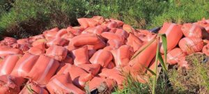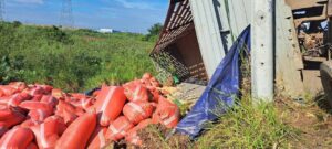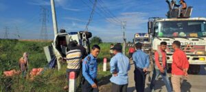 ងោកមួយភាំង ភ្ញាក់ជាន់ហ្វ្រាំងរេចង្កូតមកស្តាំក្រឡាប់ផ្ងាជើង ជះបាវស្រូវចូលប្រលាយជាង២៥តោន និងបាក់បង្គោលថ្ម សុវត្ថិភាពអស់១៣ដើម