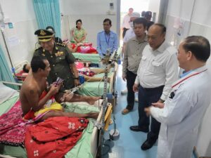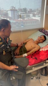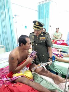 (ភ្នំពេញ)៖ នាយឧត្តមសេនីយ៍ ខឹម សោភ័ណ ប្រធានក្រុមប្រឹក្សាភិបាលមជ្ឈមណ្ឌលសកម្មភាពកំចាត់មីនកម្ពុជា នៅព្រឹកថ្ងៃទី២១ ខែសីហា ឆ្នាំ២០២៥នេះ បានចុះសួរសុខទុក្ខ និងនាំយកថវិកាដែលទទួលបានពីការឧបត្ថម្ភរបស់សប្បុរសជនខ្មែរ កំពុងរស់នៅទីក្រុងឡុងប៉ិច រដ្ឋកាលីហ្វ័រនីញ៉ា សហរដ្ឋអាមេរិក មកប្រគល់ជូនវីរកងទ័ពកម្ពុជា ដែលមានរបួសក្នុងសមរភូមិការពារទឹកដី ពីការឈ្លានពានរបស់កងទ័ពថៃ ដែលកំពុងសម្រាកព្យាបាលយ៉ាងយកចិត្តទុកដាក់ពីក្រុមគ្រូពេទ្យ នៅមន្ទីរពេទ្យមិត្តភាពខ្មែរ-សូវៀត, មន្ទីរពេទ្យព្រះកេតុមាលា និងមន្ទីរព្រះកុសុមៈ (មន្ទីរពេទ្យលោកសង្ឃ)។