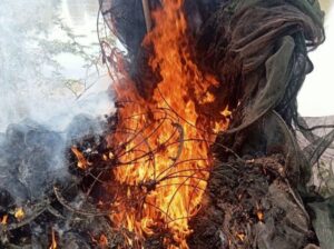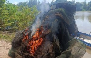 របាំងស្បៃមុងជាង3,000ម៉ែត្រ ដែលជាឧបករណ៍នេសាទខុសច្បាប់ បង្ក្រាបនិងដុតបំផ្លាញចោលនៅស្រុកពាមជរ ខេត្តព្រៃវែង