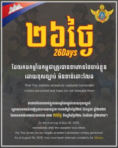 immediately after the ceasefire took effect, the Thai armed forces illegally arrested Cambodian military personnel. As of August 24, 2025, they have been detained unlawfully for 26days.
