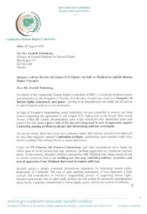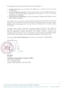 គណៈកម្មាធិការសិទ្ធិមនុស្សកម្ពុជា ផ្ញើលិខិតទៅវិទ្យាស្ថានសិទ្ធិមនុស្សស៊ុយអ៊ែត ស្នើឱ្យពិនិត្យមើលឡើងវិញអំពីកិច្ចព្រមព្រៀងលក់យន្ដហោះចម្បាំង Gripen ដល់ប្រទេសថៃ