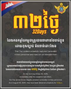 immediately after the ceasefire took effect, the Thai armed forces illegally arrested Cambodian military personnel. As of August 30, 2025, they have been detained unlawfully for 32days.