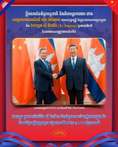 នៅរសៀលថ្ងៃទី៣០ ខែសីហា ឆ្នាំ២០២៥ សម្តេចមហាបវរធិបតី ហ៊ុន ម៉ាណែត នាយករដ្ឋមន្ត្រីនៃព្រះរាជាណាចក្រកម្ពុជា បានដឹកនាំគណៈប្រតិភូជួបប្រជុំការងារទ្វេភាគីជាមួយឯកឧត្តម ស៊ី ជីនពីង ប្រធានាធិបតីនៃសាធារណរដ្ឋប្រជាមានិតចិន ក្នុងឱកាសនៃការចូលរួមកិច្ចប្រជុំកំពូល នៃអង្គការសហប្រតិបត្តិការសៀងហៃ បូក ពីថ្ងៃទី៣០ ខែសីហា ដល់ថ្ងៃទី០១ ខែកញ្ញា ឆ្នាំ២០២៥ នៅទីក្រុងធានជីង សាធារណរដ្ឋប្រជាមានិតចិន។