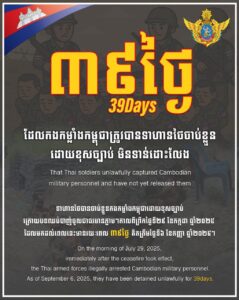 immediately after the ceasefire took effect, the Thai armed forces illegally arrested Cambodian military personnel. As of September 5, 2025, they have been detained unlawfully for 38days.