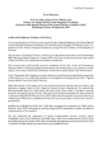 លោកនាយករដ្ឋមន្រ្តី ទៀ សីហា បានបញ្ជាក់ដូចនេះនាថ្ងៃទី១០ ខែកញ្ញា ឆ្នាំ២០២៥នេះ នាឱកាសដែលលោកបានអញ្ជើញធ្វើសន្និសីទសារព័ត៌មានបង្ហាញពីលទ្ធផលនៃកិច្ចប្រជុំពិសេសលើកទី១ របស់គណៈកម្មាធិការព្រំដែនទូទៅ (GBC) កិច្ចប្រជុំនេះបានធ្វើឡើងដោយកម្ពុជាធ្វើជាម្ចាស់ផ្ទះនៅខេត្តកោះកុង រវាងនាយឧត្តមសេនីយ៍ ទៀ សីហា ឧបនាយករដ្ឋមន្ដ្រី រដ្ឋមន្ដ្រីក្រសួងការពារជាតិ និងលោក ណាត់ថាក់ផុន ណាកផានីត រដ្ឋមន្ដ្រីស្តីទីក្រសួងការពារជាតិថៃ។