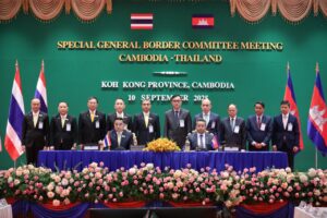 (ភ្នំពេញ)៖ សម្តេចបវរធិបតី ហ៊ុន ម៉ាណែត នាយករដ្ឋមន្ត្រីនៃកម្ពុជា បានប្រកាសសូមស្វាគមន៍ចំពោះលទ្ធផលវិជ្ជមាននៃកិច្ចប្រជុំពិសេសលើកទី១ នៃគណៈកម្មាធិការព្រំដែនទូទៅ កម្ពុជា-ថៃ (GBC) ដែលប្រព្រឹត្តទៅនៅខេត្តកោះកុង ដោយប្រទេសកម្ពុជាធ្វើជាម្ចាស់ផ្ទះ នៅថ្ងៃពុធ ទី១០ ខែកញ្ញា ឆ្នាំ២០២៥។