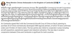 ឯកឧត្តម វ៉ាង វិនពីន បានសរសេរថា កាលពីថ្ងៃទី៨ ខែកញ្ញា ក្រុមហ៊ុនកម្ពុជា Cambodia Airways និង ក្រុមហ៊ុនចិន Commercial Aircraft Corporation of China, Ltd.,(COMAC) បានអនុស្សរណៈ នៃការយោគយល់គ្នា អំពីការគ្រោងនឹងទិញយន្តហោះដែលផលិតដោយចិនផ្ទាល់គឺ C909 regional ចំនួន ២០ គ្រឿង ដែលក្នុងនោះចំនួន ១០គ្រឿងបានបញ្ជាក់ការបញ្ជាទិញ និងចំនួន ១០គ្រឿងផ្សេងទៀតមានបំណងបញ្ជាទិញ។ ភាគីទាំងពីរនូវគ្រោងនឹងសហការគ្នាលើវិស័យការបញ្ជាទិញយន្តហោះ ការគាំទ្រប្រតិបត្តិការ និងបណ្ដុះបណ្ដាលផលិតកម្មជាដើម។