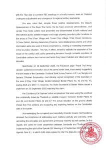 និងអន្តរជាតិ អំពីផែនទីរូបភាពផ្កាយរណប និងប្លង់ទីតាំងបង្គោលព្រំដែន នៅតំបន់ភូមិព្រៃចាន់ និងភូមិជោគជ័យ ឃុំអូរបីជាន់ ស្រុកអូរជ្រៅ ខេត្តបន្ទាយមានជ័យ ដោយប្រើប្រាស់ឯកសារ និងព័ត៌មានទ្វេភាគីមួយចំនួន មិនត្រឹមតែយកមកបកស្រាយប្រាសចាកពីការពិតប៉ុណ្ណោះទេ ថែមទាំងយកមកធ្វើជាមូលដ្ឋានក្នុងការពង្រីកវិសាលភាពជម្លោះ និងបង្កឱ្យមានភាពតានតឹង តាមរយៈការបណ្ដេញដោយខុសច្បាប់ប្រជាពលរដ្ឋខ្មែរចេញពីផ្ទះ និងដីដែលពួកគាត់បានរស់នៅនិងអាស្រ័យផលជាច្រើនទសវត្សរ៍មកហើយ។