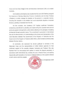 ស្របតាមស្មារតីនៃកិច្ចប្រជុំពិសេសលើកទី១នៃគណៈកម្មាធិការព្រំដែនទូទៅ (GBC) លោកជំទាវ បានបញ្ជាក់ផងដែរថា កម្ពុជាត្រៀមខ្លួនរួចជាស្រេច ក្នុងការបន្តសម្របសម្រួលជាមួយភាគីថៃ ដើម្បីរៀបចំកិច្ចប្រជុំគណៈកម្មាធិការព្រំដែនថ្នាក់យោធភូមិភាគ (RBC) ឱ្យបានទាន់ពេលវេលា បើទោះបីជាមានភាគីថា មានការលំបាកដោយសារការកែសម្រួល និងការផ្លាស់ប្តូរថ្នាក់ដឹកនាំតាមបណ្តាយោធភូមិភាគរបស់ខ្លួនយ៉ាងណាក៏ដោយ។