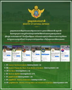 ក្រសួងការពារជាតិ សូមអំពាវនាវឱ្យសាធារណជន អ្នកសារព័ត៌មានជាតិ អន្តរជាតិ និងបងប្អូនប្រជាពលរដ្ឋទាំងអស់ទទួលយកតែព័ត៌មានដែលមានប្រភពច្បាស់លាស់ ត្រឹមត្រូវ ទាន់ហេតុការណ៍ និងជឿទុកចិត្តបាន ជាពិសេសការផ្តល់ជូនព័ត៌មានដោយរាជរដ្ឋាភិបាល ទំព័រផ្លូវការរបស់ថ្នាក់ដឹកនាំ និងក្រសួងពាក់ព័ន្ធមួយចំនួន ដើម្បីទទួលបានព័ត៌មានរួមមាន៖