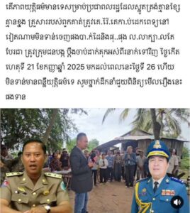 អ្នកនាំពាក្យកងរាជអាវុធហត្ថលើផ្ទៃប្រទេស ចេញសេចក្តីប្រកាសព័ត៌មាន ពាក់ព័ន្ធករណីអំពើហិង្សាដោយចេតនា នៅភូមិភ្នំបាទេព ឃុំព្រែកផ្ទោល ខេត្តតាកែវ ដោយគ្មានបុគ្គលណាម្នាក់ជាអាវុធហត្ថនោះឡើយ