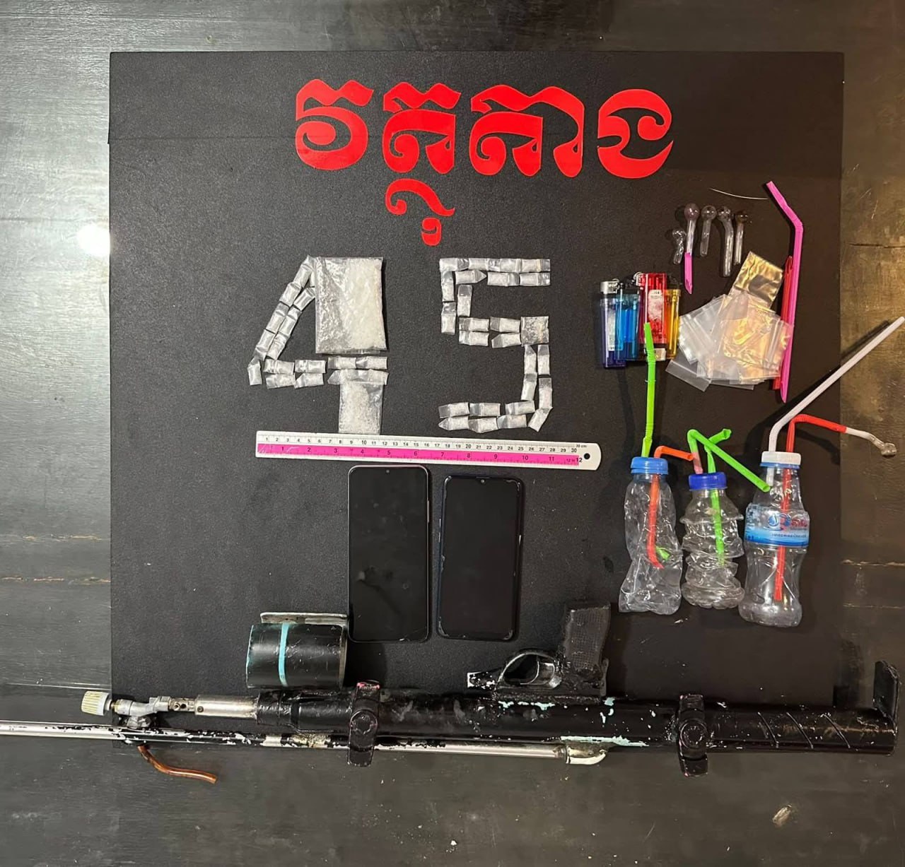 -ឧបករណ៍ប្រើប្រាស់ និងថង់វេចខ្ចប់គ្រឿងញៀនមួយចំនួន។