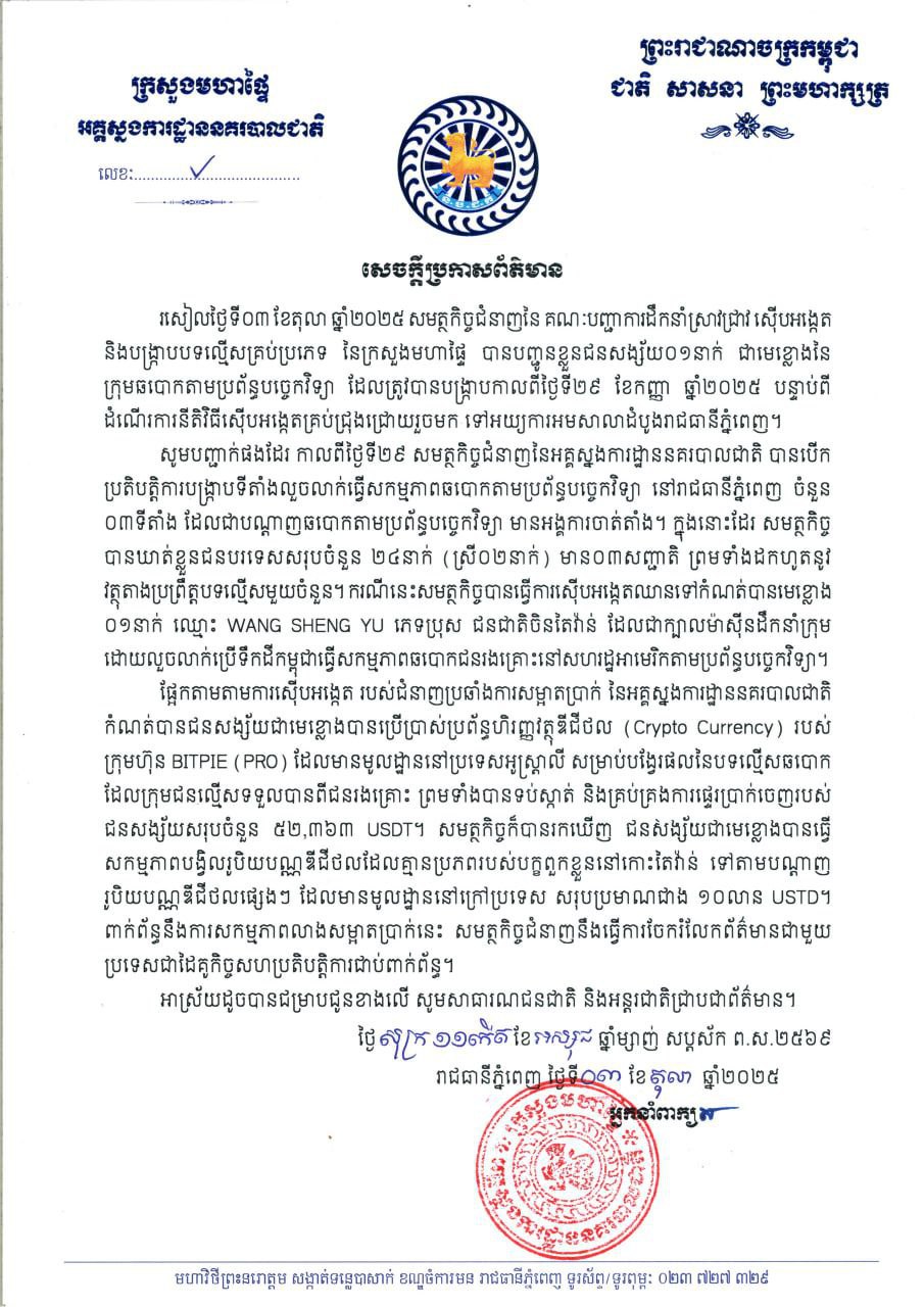 សូមបញ្ជាក់ថា កាលពីថ្ងៃទី២៩ ខែកញ្ញា សមត្ថកិច្ចជំនាញ នៃអគ្គស្នងការដ្ឋាននគរបាលជាតិ បានបើកប្រតិបត្តិការបង្ក្រាប ទីតាំងលួចលាក់ធ្វើសកម្មភាព ឆបោកតាមប្រព័ន្ធបច្ចេកវិទ្យា នៅរាជធានីភ្នំពេញ ចំនួន៣ទីតាំង ដែលជាបណ្តាញឆបោកតាមប្រព័ន្ធបច្ចេកវិទ្យា មានអង្គការចាត់តាំង។ ជាលទ្ធផល កម្លាំងសមត្ថកិច្ចបានឃាត់ខ្លួនជនបរទេសសរុបចំនួន ២៤នាក់ (ស្រី០២នាក់) មាន០៣សញ្ជាតិ ព្រមទាំងដកហូតនូវ វត្ថុតាងប្រព្រឹត្តបទល្មើសមួយចំនួន។