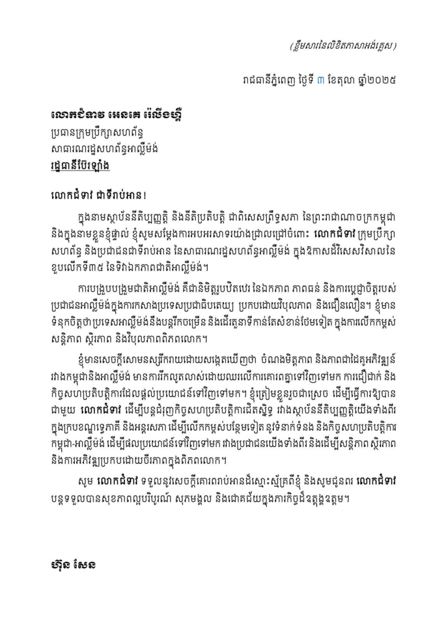 សម្តេចតេជោ ហ៊ុន សែន ប្រមុខរដ្ឋស្តីទី ផ្ញើសារលិខិតជូនប្រធានក្រុមប្រឹក្សាសហព័ន្ធ សាធារណរដ្ឋសហព័ន្ធអាល្លឺម៉ង់ អបអរសាទរក្នុងឱកាសខួបអនុស្សាវរីយ៍លើកទី៣៥ នៃទិវាឯកភាពជាតិអាល្លឺម៉ង់