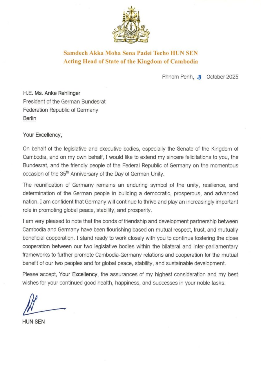 (ភ្នំពេញ)៖ សម្តេចតេជោ ហ៊ុន សែន ប្រមុខរដ្ឋស្តីទីនៃព្រះរាជាណាចក្រកម្ពុជា នៅថ្ងៃទី៣ ខែតុលា ឆ្នាំ២០២៥នេះ ផ្ញើសារលិខិតអបអរសាទរជូន លោកស្រី អេនគេ រ៉េលីងហ្គឺ ប្រធានក្រុមប្រឹក្សាសហព័ន្ធសាធារណរដ្ឋសហព័ន្ធអាល្លឺម៉ង់ ក្នុងឱកាសខួបអនុស្សាវរីយ៍លើកទី៣៥ នៃទិវាឯកភាពជាតិអាល្លឺម៉ង់។