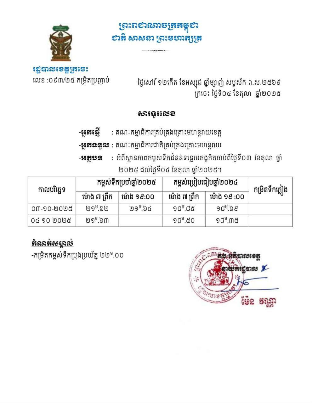 ស្ថានភាពកម្ពស់ទឹកជំនន់ទន្លេមេគង្គក្នុងខេត្តក្រចេះ បន្តកើនឡើងគិតចាប់ពីថ្ងៃទី០៣ ខែតុលា ឆ្នាំ ២០២៥ ដល់ថ្ងៃទី០៤ ខែតុលា ឆ្នាំ២០២៥។