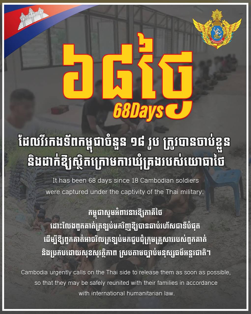ថ្ងៃនេះជា ថ្ងៃទី៦៨ហើយ ដែលវីរកងទ័ពកម្ពុជាចំនួន ១៨រូប ត្រូវបានចាប់ខ្លួន និងដាក់ឱ្យស្ថិតក្រោមការឃុំគ្រងរបស់យោធាថៃ