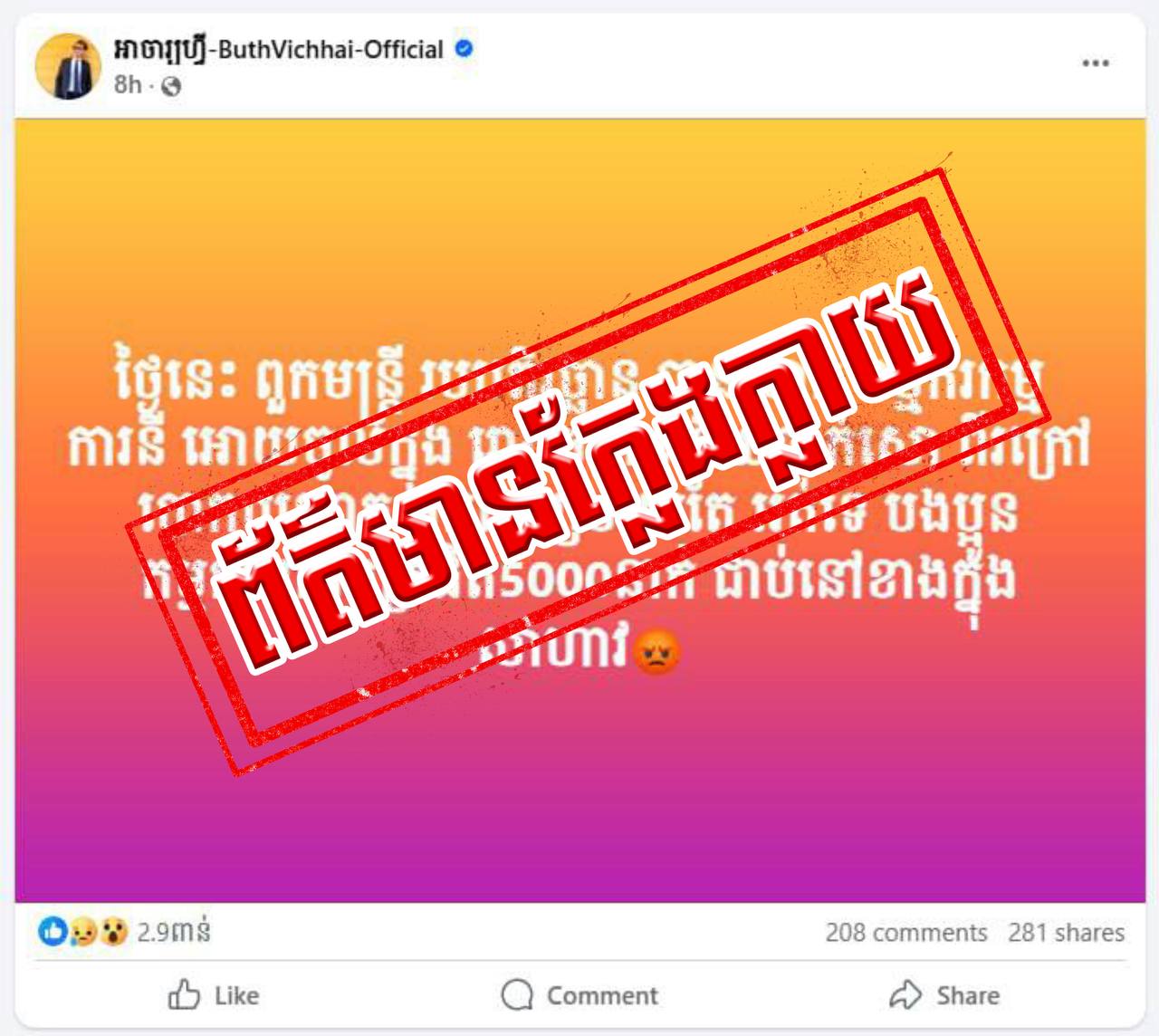 បើតាម លោក ស៊ុន មេសា ការបំភ្លៃខុសពីការពិតពីសំណាក់ក្រុមប្រឆាំងក្រៅស្រុក មិនមែនទើបតែធ្វើពេលនេះទេ ពោលគឺ ជារឿយៗ ពួកនេះតែងតែចិញ្ចឹមចិត្ត ប៉ុនប៉ងស៊កសៀតចាក់រុកបង្កបញ្ហា បង្កើតភាពវឹកវរ ការបែកបាក់សង្គម នៅពេលមានហេតុការណ៍ណាមួយកើតឡើង ហើយការបំភ្លៃនោះទៀតសោត គឺពួកគេមានបំណង ដើម្បីបំផ្លាញភាពជឿជាក់របស់ប្រជាជនលើរាជរដ្ឋាភិបាល កេងចំណេញផលប្រយោជន៍នយោបាយ ដើម្បីប្រយោជន៍ក្រុមខ្លួន និងបក្ខពួកប៉ុណ្ណោះ មិនមែនជាការផ្តល់ផលប្រយោជន៍ពិតប្រាកដជូនដល់ប្រជាពលរដ្ឋនោះទេ៕