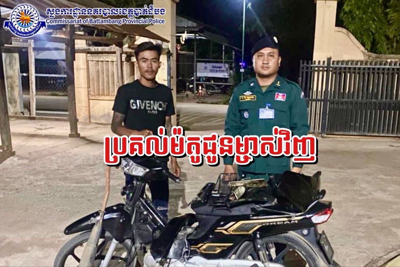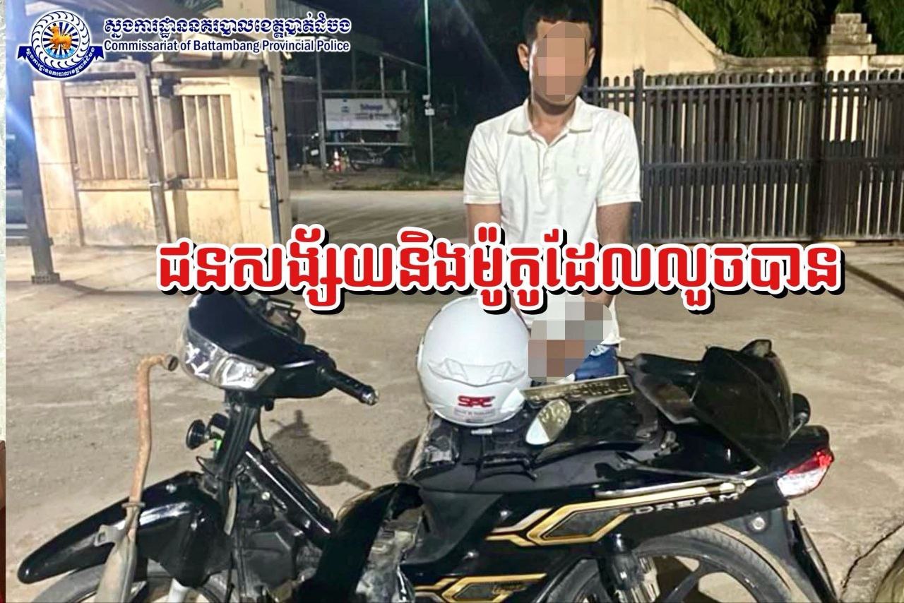ខេត្តបាត់ដំបង÷ កាលពីថ្ងៃទី០៥ ខែ តុលា ឆ្នាំ ២០២៥ ស្របតាមអនុសាសន៍ នាយឧត្តមសេនីយ៍ ស ថេត អគ្គស្នងការនគរបាលជាតិ និងក្រោមយោបល់ដឹកនាំបញ្ជារបស់លោក ឧត្តមសេនីយ៍ទោដាញ់ អេងប៊ុនចាន់ ស្នងការ នៃស្នងការដ្ឋាននគរបាលខេត្តបាត់ដំបងកម្លាំង នគរបាលស្រុកមោងឫស្សី ដែលមានលោក វរសេនីយ៍ ឯក ស គឹមឡុង ជាអធិការបានដឹក នាំកម្លាំងសហការជាមួយកម្លាំងនគរបាលស្រុកបាណន់លោកវរសេនីយ៍ ទោ ហេង បារាំង ជាអធិការនិងកម្លាំងផែនជំនាញព្រហ្មទ័ណ្ឌ នៃស្នងការដ្ឋានបានតាមស្វែងរកនិងឈានទៅឃាត់ខ្លួនបុរសម្នាក់ឈ្មោះ ធី រ៉ាមី ហៅមី ភេទ ប្រុស អាយុ២៤ឆ្នាំ រស់នៅភូមិព្រះស្រែ ឃុំស្នឹង ស្រុកបាណន ខេត្តបាត់ដំបង ក្នុងមូលដ្ឋានខាងលើ បន្ទាប់ពី បុរសរូបនេះធ្វើ សកម្មភាពកាច់សោកម៉ូតូរបស់ជនរងគ្រោះឈ្មោះនន នុត ភេទប្រុស អាយុ ១៩ឆ្នាំ រស់នៅភូមិបឹងព្រីង ឃុំព្រៃតូច ស្រុកមោងឫស្សី ខេត្តបាត់ដំបង ដែលបញ្ឈរទុកនៅមុខបន្ទប់លេខ១០ នៃមូលដ្ឋានស្នាក់នៅខាងលើកាល ពីព្រឹកថ្ងៃទី ០៤ ខែ តុលា ឆ្នាំ ២០២៥ ដោយចាក់សោរក តែត្រូវជនបុរសខាងលើលួចយក មកទុកនៅមូលដ្ឋានស្រុកបាណន់ដែលម៉ូតូជន រងគ្រោះ ម៉ាកហុងដាឌ្រីម សេ១២៥ ពណ៌ខ្មៅ ផ្លាកលេខ បាត់ដំបង 1AW-3636 សេរីឆ្នាំ២០២៤។