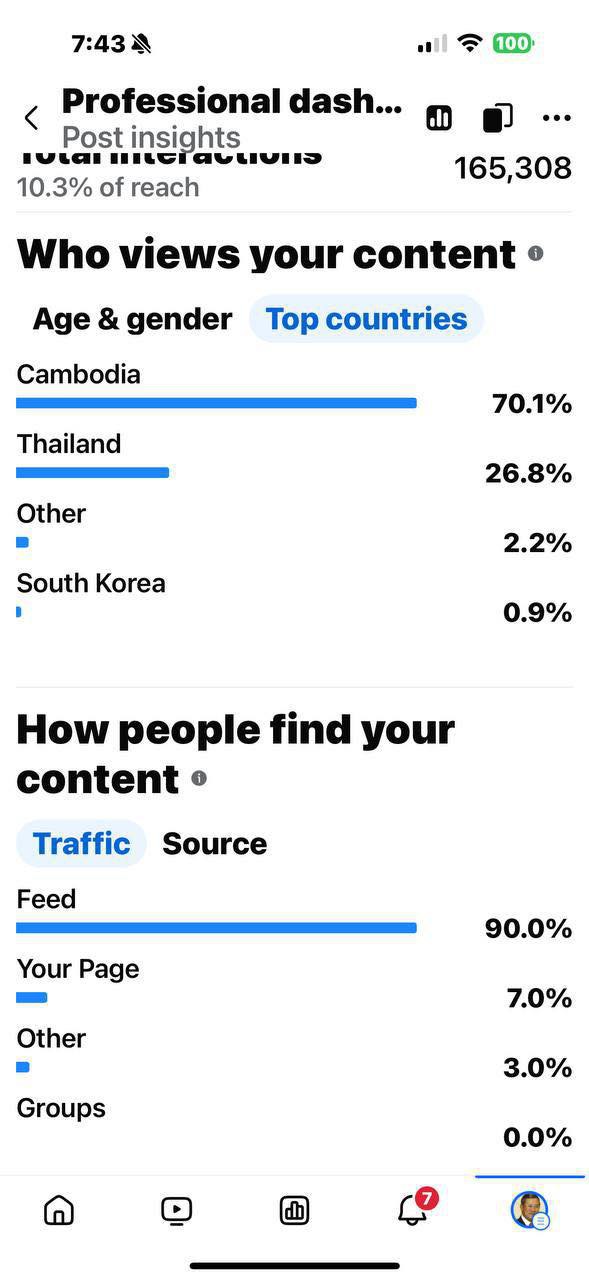 សម្ដេចតេជោ ៖ ក្រោយការបង្ហោះសាររៀបរាប់អំពីទង្វើអសីលធម៌ អគុណធម៌ដែលជាទង្វើអមនុស្សនិងអន់ជាងសត្វរបស់ជនជាតិថៃមួយចំនួនគិតត្រឹមម៉ោង៧និង៤៥នាទីល្ងាចនេះ(រយៈពេល៧ម៉ោង)មានមនុស្សចូលមើលចំនួន4,715,531នាក់ចូលមើលដែលក្នុងនោះមានជនជាតិក្នុងប្រទេសថៃចំនួន26.8%ប្រហាក់ប្រហែលជាង១លាននាក់បានចូលមើលដូចមានក្នុងតារាងជូនភ្ជាប់។