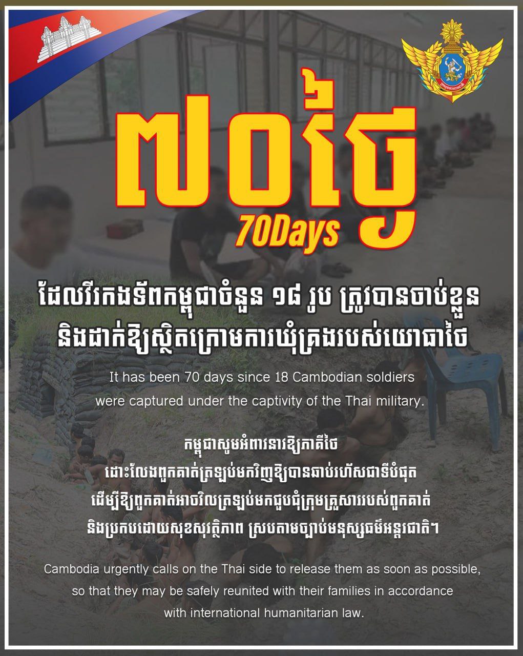 ថ្ងៃនេះជា ថ្ងៃទី៧០ហើយ ដែលវីរកងទ័ពកម្ពុជាចំនួន ១៨រូប ត្រូវបានចាប់ខ្លួន និងដាក់ឱ្យស្ថិតក្រោមការឃុំគ្រងរបស់យោធាថៃ