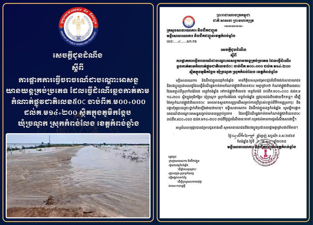 ដើម្បីថែរក្សាកំណាត់ផ្លូវជាតិលេខ៥០C ឱ្យមានស្ថានភាពល្អប្រសើរសម្រាប់ការប្រើប្រាស់បន្ទាប់ពីទឹកទន្លេស្រកចុះ និងបង្ការកុំឲ្យមានគ្រោះថ្នាក់កើតឡើងជាយថាហេតុ។ មន្ទីរសាធារណការ និងដឹកជញ្ជូនខេត្តកំពង់ឆ្នាំង សូមធ្វើការផ្អាក ចរាចរណ៍ជាបណ្ដោះអាសន្នសម្រាប់យានយន្តគ្រប់ប្រភេទ ដែលធ្វើដំណើរឆ្លងកាត់តាមកំណាត់ផ្លូវជាតិលេខ៥០C ចាប់ពីគ.ម០០+០០០ ដល់គ.ម១៤+២០០ ចាប់ពីថ្ងៃជូនដំណឹងនេះតទៅ រហូតដល់មានការជូនដំណឹងសារជាថ្មី៕
