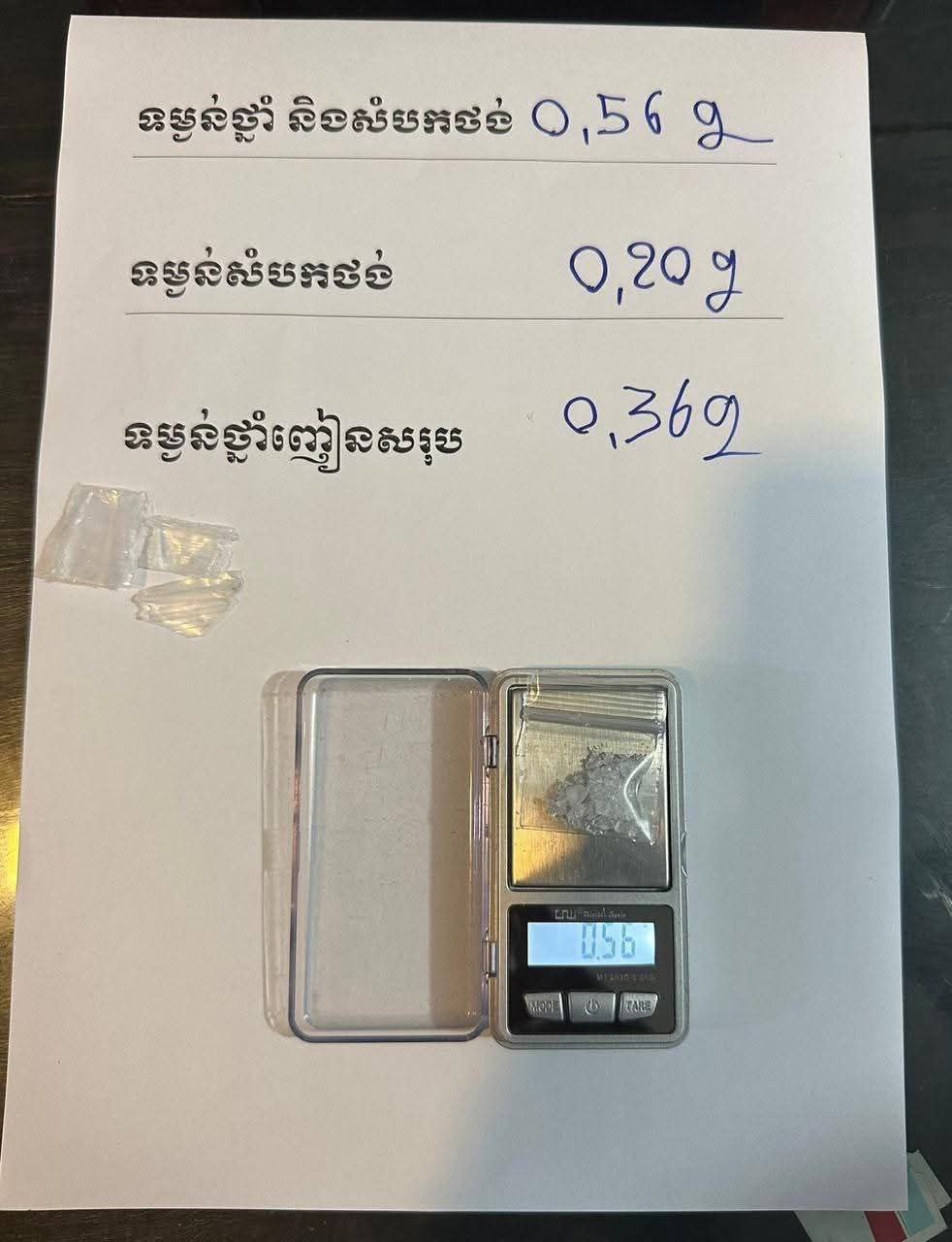 លោកវរសេនីយ៍ឯក មាន សំណាង អធិការនគរបាលស្រុកអង្គស្នួល បានឲ្យដឹងថា ជនសង្ស័យទាំង ៥នាក់ដែលត្រូវបានឃាត់ខ្លួនមានសារធាតុញៀនក្នុងខ្លួនវិជ្ជមាន (+)។ ជនទាំងនោះមានឈ្មោះ នួន វុទ្ធី (ហៅធី) ភេទប្រុស អាយុ៥០ឆ្នាំដែលធ្លាប់ជាប់គុកពីបទជួញដូរគ្រឿងញៀន, ឈ្មោះ យ៉េន ឌីម៉ង់ (ហៅតូច)ភេទប្រុស អាយុ ២៩ឆ្នាំ,ឈ្មោះ មាន ម៉ាញ ភេទប្រុស អាយុ ២៥ ឆ្នាំ,ឈ្មោះ រី សុខគា ភេទប្រុស អាយុ ២៨ឆ្នាំនិងឈ្មោះ ផន ដានិត (ហៅរិទ្ធ) ភេទប្រុស អាយុ២៩ឆ្នាំ។ ចំណែកបក្ខពួកម្នាក់ទៀតឈ្មោះ ចេក ជួរ (ហៅចយ) ភេទប្រុស អាយុ ៣៣ឆ្នាំ បានរត់គេចខ្លួនបាត់។ វត្ថុតាងសរុបដែលដកហូតបានរួមមាន ម្សៅក្រាមសថ្លាសង្ស័យជាសារធាតុញៀន (ម៉ាទឹកកក) ចំនួន ២កញ្ចប់តូច ទម្ងន់ ០,៣៦ ក្រាម, ទូរសព្ទដៃ ៤គ្រឿង និងឧបករណ៍ប្រើប្រាស់គ្រឿង ញៀនមួយចំនួន។