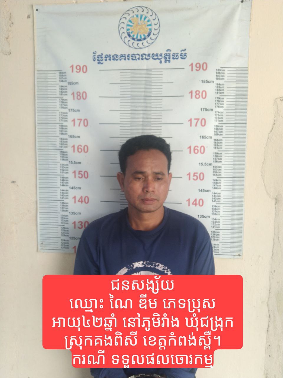 ២.ឈ្មោះ ណៃ ឌីម ភេទប្រុស អាយុ ៤២ឆ្នាំ រស់នៅភូមិរាំង ឃុំជង្រុក ស្រុកគងពិសី (ស្ពឺ)ជាមុខសញ្ញាទទួលផលចោរកម្ម មានដីចាប់ខ្លួន ចំនួន ០៣ច្បាប់