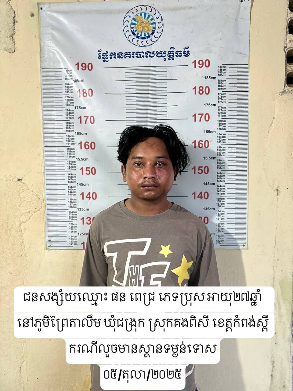 ២.ឈ្មោះ ផន ពេជ្រ ភេទប្រុស អាយុ ២៧ឆ្នាំ នៅភូមិព្រៃតាលឹម ឃុំជង្រុក ស្រុកគងពិសី ខេត្តកំពង់ស្ពឺ។