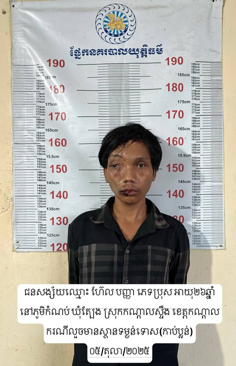 ១.ឈ្មោះ ហែល បញ្ញា ភេទប្រុស អាយុ ២៦ឆ្នាំ រស់ភូមិកំណប់ ឃុំត្បែង ស្រុកកណ្ដាលស្ទឹង ខេត្តកណ្ដាល ។