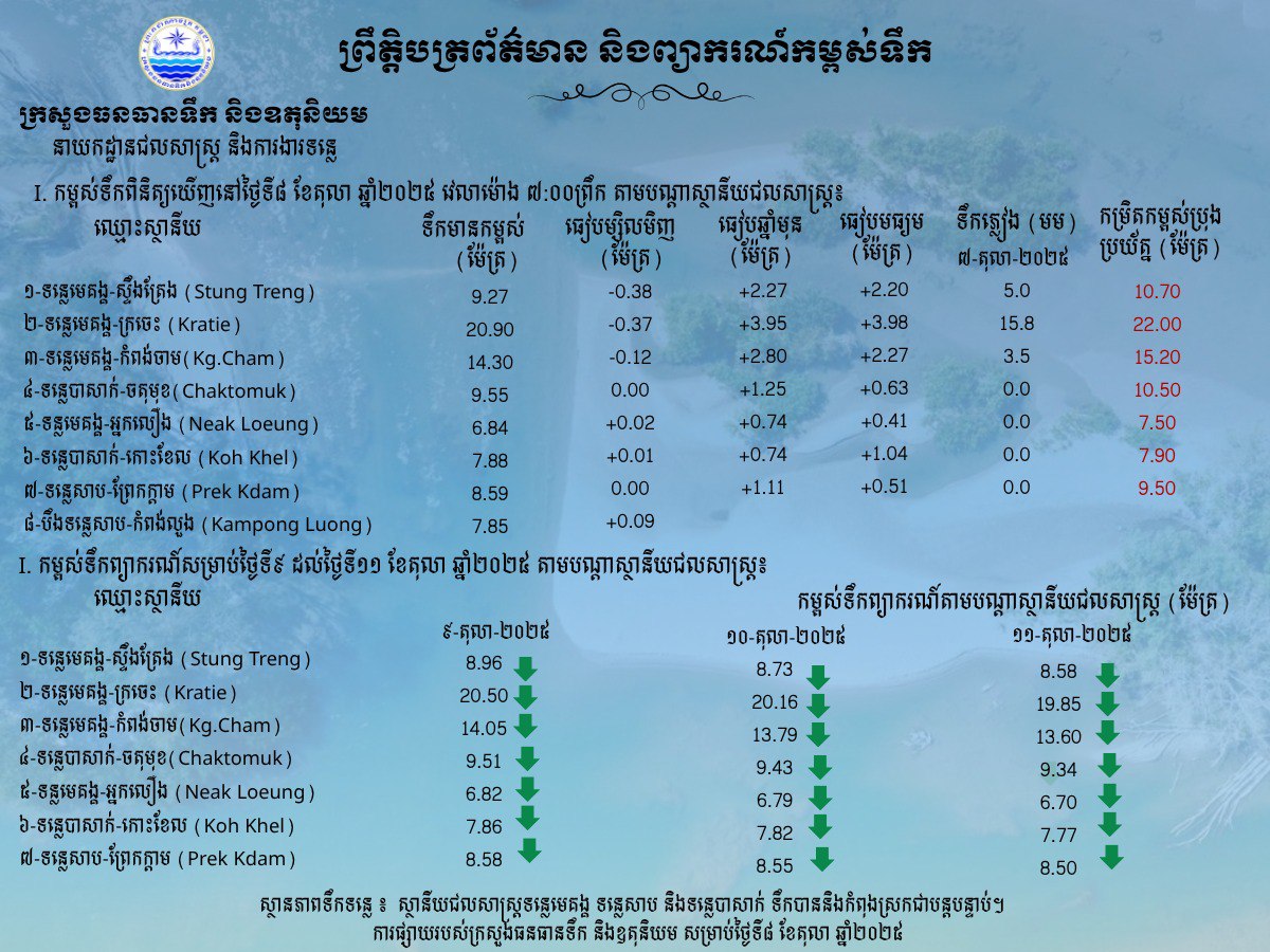 ស្ថានភាពទឹកទន្លេ ៖ ស្ថានីយជលសាស្ត្រទន្លេមេគង្គ ទន្លេសាប និងទន្លេបាសាក់ ទឹកបាននិងកំពុងស្រកជាបន្តបន្ទាប់។